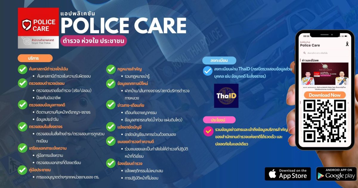 ด้วย พล.ต.อ. กิตติ์รัฐ พันธุ์เพ็ชร์ ผบ.ตร. และ พล.ต.อ.นิรันดร เหลือมศรี รอง ผบ.ตร.(กม) มอบหมายให้ กม. และ ศทก. ดำเนินการจัดทำ “แอปพลิเคชัน ตำรวจห่วงใยประชาชน (POLICE CARE)” เพื่อเป็นช่องทางกลางสำหรับประชาชนในการเข้าถึงข้อมูลกฎหมาย คู่มือประชาชน การเตรียมเอกสารแจ้งความ การตรวจสอบข้อมูลบริการ และข่าวสารจาก ตร. อย่างครบวงจร